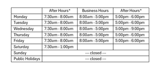 Our After Hours Support times are currently under review as we are looking at extending these hours later this year.